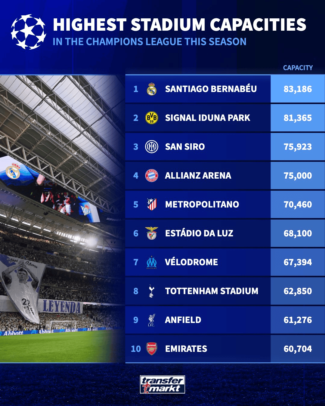 虎扑09月18日讯 欧冠比赛日,德转发布榜单统计新赛季36支欧冠参赛队的主场中,容量最大的10座球场。